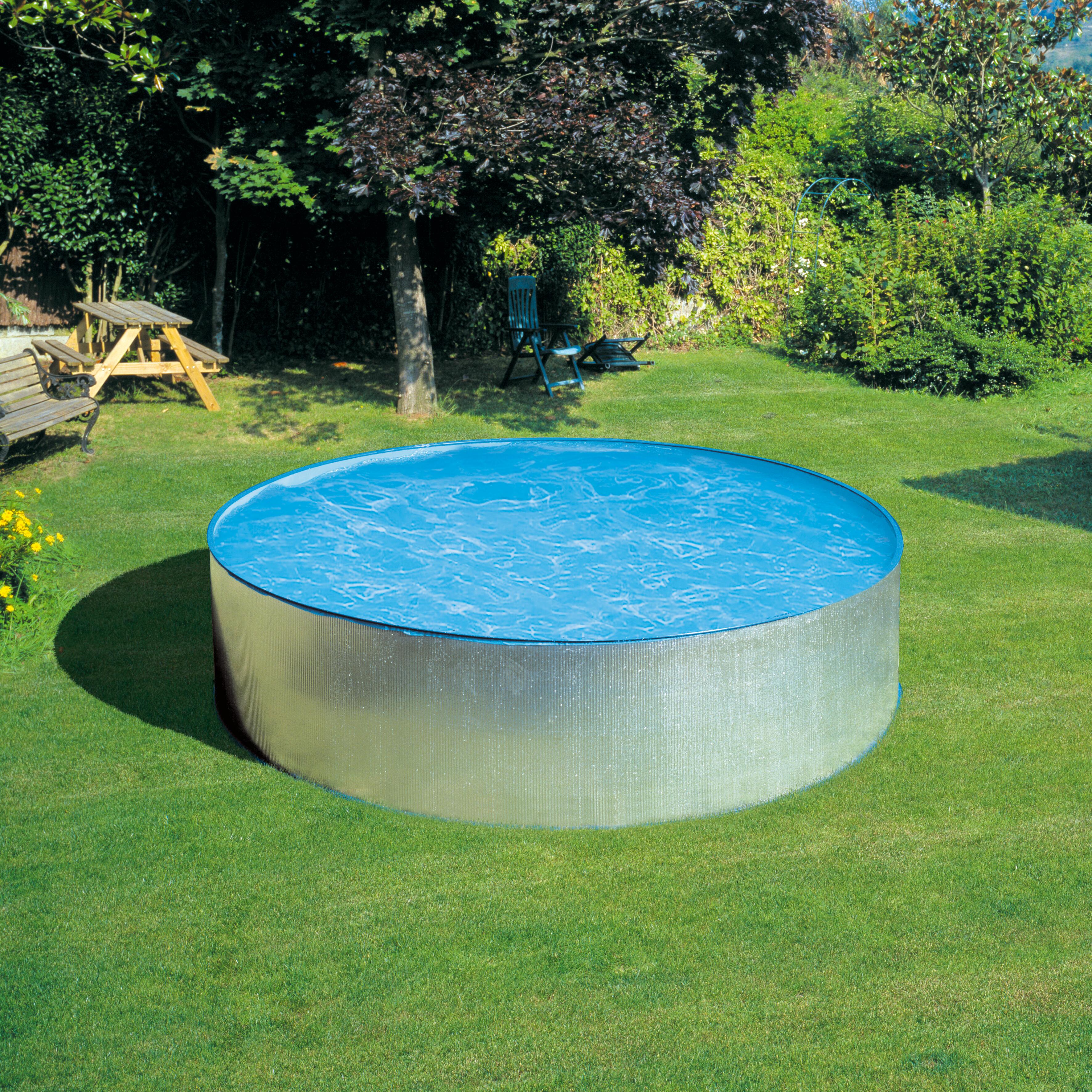 KIT Piscina tonda acciaio galvanizzato. Liner blu 20/100 . Filtro ad immersione 2m³/h. Scala 2x3 gradini. Dim: Ø 350 h 90