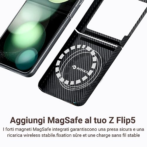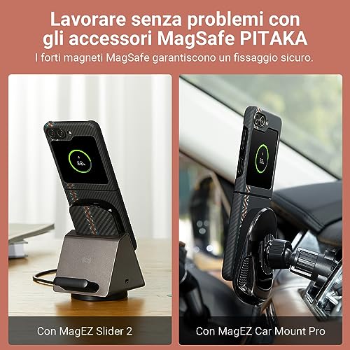 [Compatibilità] Compatibile solo con Samsung Flip 5, 5G. Grazie alle strisce metalliche integrate, la custodia per Galaxy Flip 5 si attacca al caricabatterie wireless PITAKA MagSafe (MagEZ Car Mount Pro, MagEZ Slider) per un'esperienza di ricarica senza interruzioni.