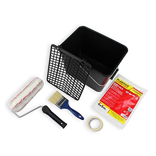 Kit pittore professionale: rullo 22 cm + vaschetta 14 L con griglia + pennello + plastica copertura 20 m² + nastro per pittore