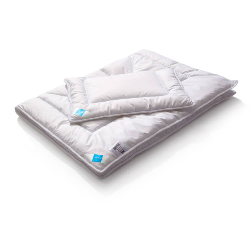 Set antiallergico, Dimensioni: 90x120 + 40x60cm, Materiale: 100% cotone, Imbottitura: poliestere silicizzato, Peso: 450 g. Tipologia piumino: tutto l'anno, trapuntato su tutta la superficie, Tipologia cuscino: monocamera, altezza moderata Destinato ai bambini 0-3 anni Tessuto: 100% cotone, Colore: bianco. Il prodotto è certificato Oeko-Tex® Standard 100