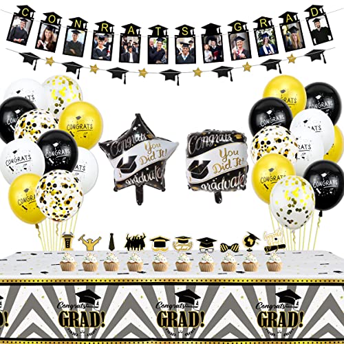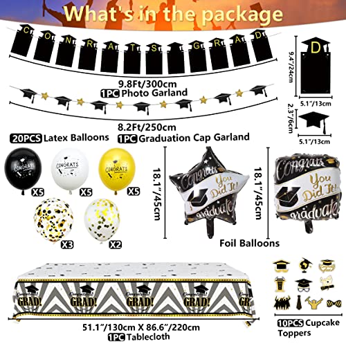 PIXHOTUL Decorazioni per Feste di Laurea 2022-2022 Forniture per la Laurea - Banner Photo Ghirlanda Tovaglia Palloncini in Lattice Palloncini Cupcake Toppers Pacchetto Festa (Nero e Oro)