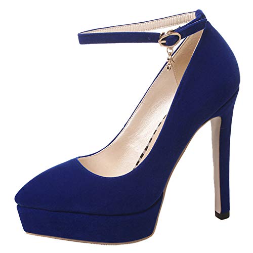 PIXIEFOOT Scarpe Decolte Donna con Tacco a Spillo Alto Plateau Cinturino alla Caviglia Pointed Toe (39 EU, Blu)