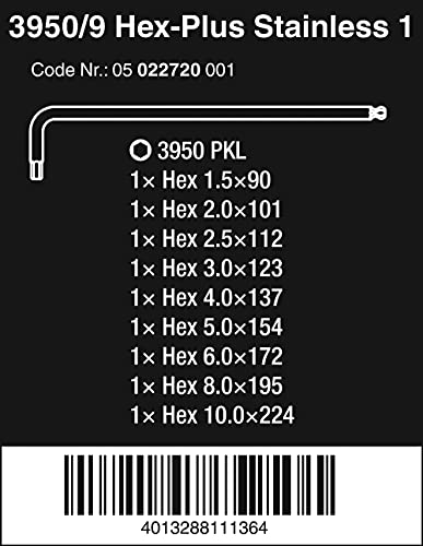 Wera, 3950 PKL/9 Assortimento di chiavi a L, metriche, in acciaio inox, 9 pezzi
