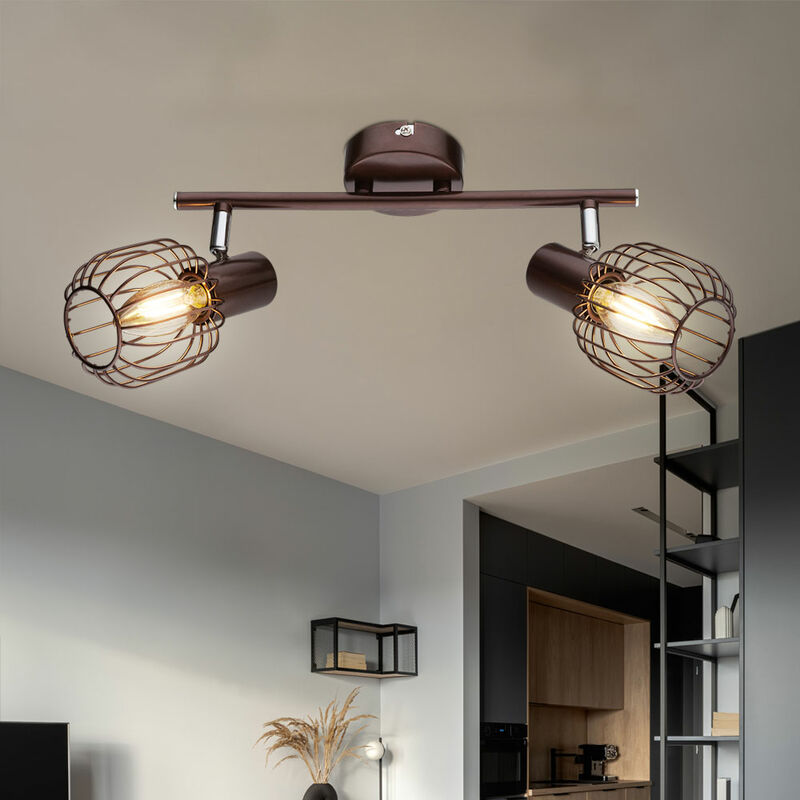Descrizione L'insolita combinazione di metallo color ruggine, marrone e cromato in un design a gabbia è ciò che rende così speciale questo tradizionale faretto da parete o soffitto. I due spot mobili a gabbia, fissati a un braccio dritto, dispongono ciascuno di una presa E14 che consente di determinare da soli la sorgente luminosa (max. 40W) e quindi anche l'intensità e il colore della luce. Consigliamo le lampade a LED per il loro risparmio energetico e la loro longevità. Puoi completare il quadro della tua zona giorno con altre lampade della stessa serie di modelli. Dettagli • faretti color bronzo • cromo • marrone • LxH: 325x150 • escl. 2xE14 40W 230V • materiale: bronzo, cromo • paralume: marrone • Colore: color bronzo • colore paralume: marrone • dimensioni AxP in cm: 15x32,5 • numero di prese: 2 • base: E14 • potenza massima: 40 W (watt) • voltaggio: 230 V (volt) • sorgente luminosa dimmerabile: no • sorgente luminosa inclusa: no