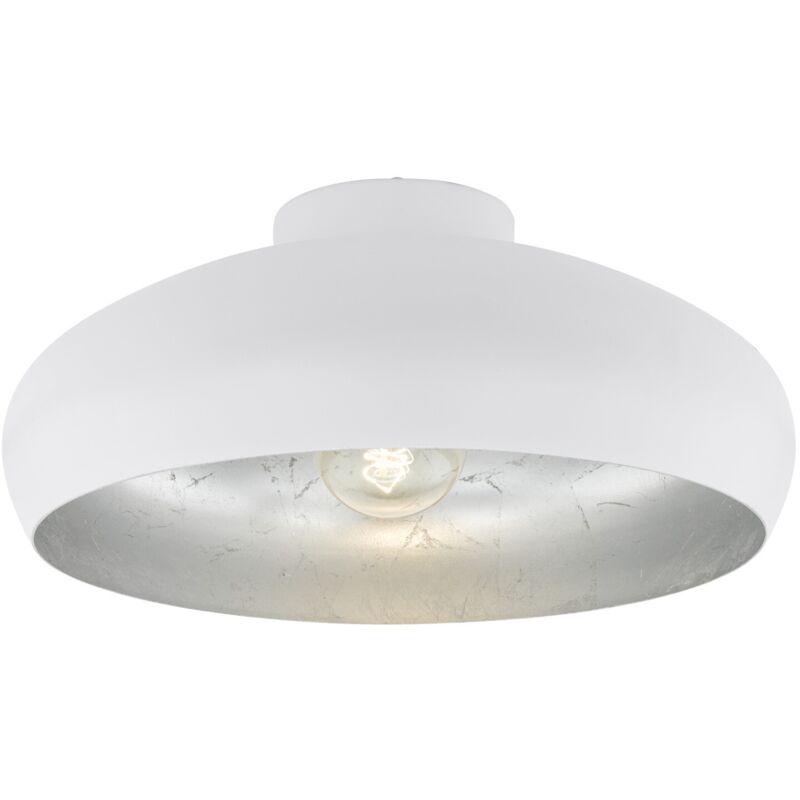 Collezione Mogano LA LAMPADA MINIMALISTA PER I TUOI AMBIENTI MODERNI La plafoniera MOGANO è composta da un paralume rotondo in metallo bianco e un interno color argento.. Questa lampada si armonizza perfettamente con arredamenti moderni. Offre un'illuminazione semplice e omogenea in qualsiasi ambiente, che sia in cucina, soggiorno, camera da letto o lungo il corridoio. La lampadina a filamento non è inclusa nella consegna. Per la lampada è adatta qualsiasi lampadina con attacco E27.