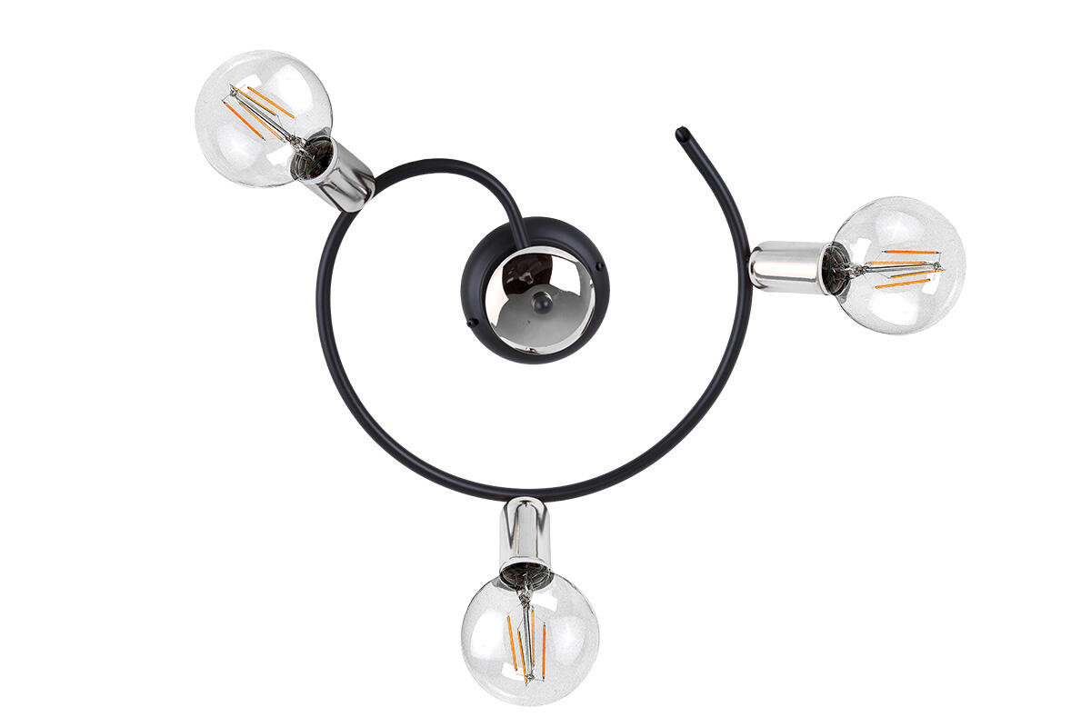 Plafoniera design Betty di Novecento. Dotata di 3 attacchi E27, adatta a lampadine massimo 42W. La plafoniera è verniciata in nero opaco con parti in cromo. E fornita senza lampadine.
