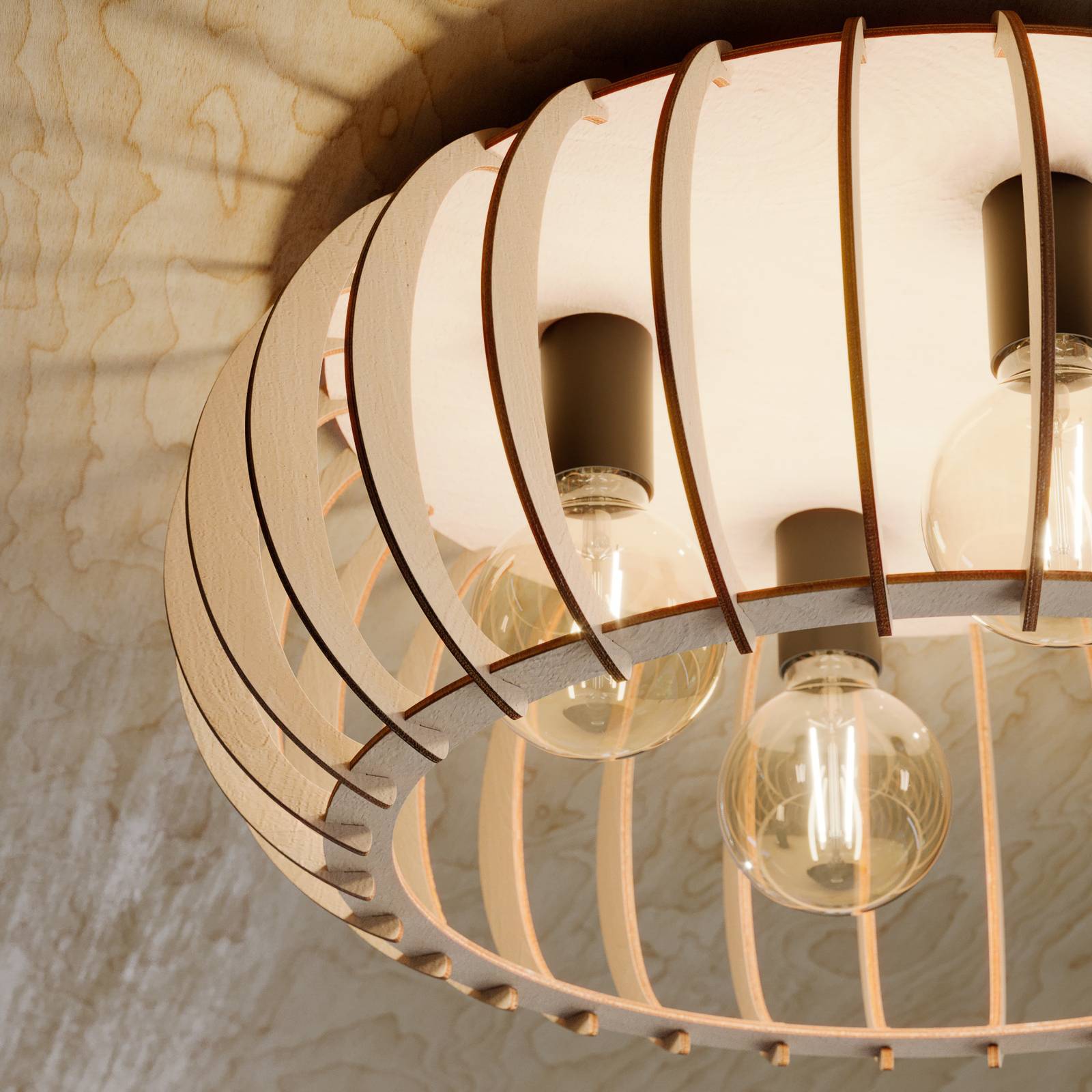 Plafoniera semicircolare Iden in compensato di betulla certificato FSC La plafoniera Iden è realizzata in compensato di betulla e ha un design molto aperto. I singoli elementi in legno hanno una forma stretta e semicircolare e sono fissati a distanza l'uno dall'altro. Questo conferisce al paralume la sua forma aperta. Grazie alla luce e alla colorazione naturale, la plafoniera può essere integrata in diverse aree abitative e può essere utilizzata come fonte di luce nel corridoio, nel soggiorno e nella camera da letto. Le fonti di luce decorative sono particolarmente adatte per l'illuminazione, in quanto la loro vista è libera. Le sorgenti luminose possono essere selezionate liberamente in base alla portalampada e alla potenza appropriata. Le condizioni di illuminazione possono quindi essere adattate in modo ottimale alle preferenze personali. La luce viene emessa verso il pavimento e anche ai lati. Gli elementi in legno creano speciali effetti di luce nella stanza. Il compensato di betulla utilizzato è certificato FSC e proviene da aree forestali ecologiche. Anche il marchio Envostar attribuisce grande importanza alla sostenibilità, producendo le sue lampade in Europa. Ciò si traduce in brevi percorsi di trasporto e basse emissioni di CO2. L'imballaggio è realizzato con materiali riutilizzabili.