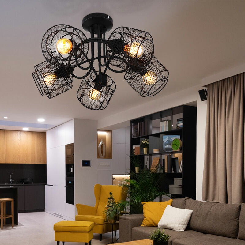 Descrizione Questa moderna lampada a sospensione colpisce per il suo fantastico design e diventerà il punto focale della tua stanza. Due eleganti maglie metalliche nere formano una delle 5 tonalità con prese E14. Questi pendono a 27,5 cm dal soffitto tramite cavi neri regolabili a forma di nodi. Le prese E14 ti permettono di scegliere liberamente il tuo illuminante fino ad una potenza massima di 40 watt. Le lampadine non sono comprese nella fornitura. Lampada di dettaglio • Tipo di lampada: plafoniera • Materiale: metallo, nichel satinato • Paralume: nero • 5 luci • Punti mobili • Grado di protezione: IP20 • Classe di protezione: 1 • Diametro x altezza in cm: 46 x 27,5 • Prese: 5x E14 • Lampadina inclusa: no • Potenza lampada: 5x massimo 40 watt • Voltaggio: 230V, 50-60Hz