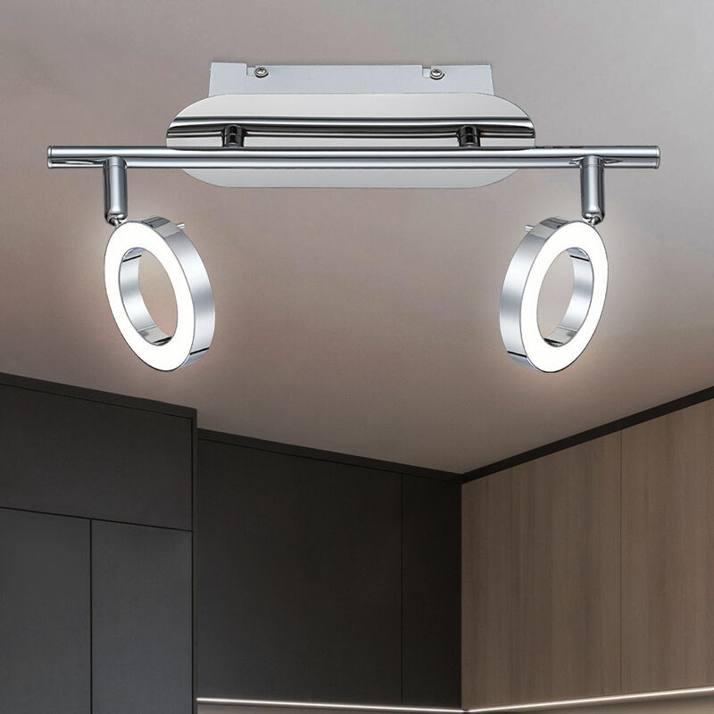 Descrizione Questa moderna plafoniera a LED è dotata di corpi luminosi orientabili. La gli anelli luminosi ricordano i faretti e possono essere allineati secondo necessità. Che si tratti di soggiorno, sala da pranzo o camera da letto, questa lampada moderna taglia una bella figura ovunque. I faretti LED consumano solo una minima quantità di elettricità e sono persino più bassi rispetto alle lampade a risparmio energetico. Questo ti salva l'ambiente e il tuo portafoglio. Sono incluse due lampadine LED di alta qualità. Dettagli lampada • Tipologia: plafoniera • Materiale: cromo• Colore: satinato acrilico • Grado di protezione IP20• Dimensioni Lunghezza x larghezza x altezza in cm: 34x8x16 • Prese: 2x LED • lampadine incluse: sì • lampadine: 2x LED 5W • colore della luce: bianco caldo • flusso luminoso totale: 2x 350 lm (totale 520 lumen) Dettagli lampade • Socket: LED • di energia consumo: 5 kWh / 1000h • Consumo energetico nominale: 5 W (watt) • Voltaggio: 10V (Volt) • Frequenza