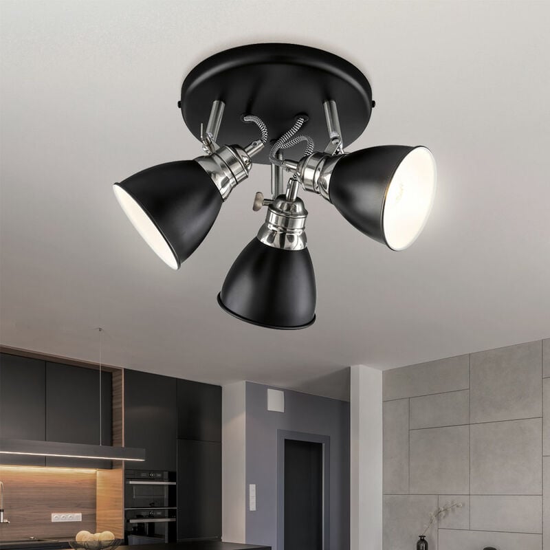 Descrizione Il faretto con i suoi tre faretti può suscitare un vero entusiasmo grazie al suo design retrò. L'aspetto della plafoniera può essere combinato bene con lo stile vintage o industriale. Gli schermi neri con le staffe cromate completano il design. I faretti possono essere orientati per garantire un'illuminazione adeguata alle esigenze. La plafoniera deve essere dotata di tre lampadine E14 con un massimo di 10 watt. Le lampadine non sono incluse! dettagli • Tipo di lampada: plafoniera • Materiale: metallo • Colore: nero, cromato • Grado di protezione: IP20 • Classe di protezione: 1 • Spot mobili • Diametro x altezza in cm: 35 x 22 • Prese: 3x E14 • Lampadina inclusa: No • Potenza della lampada: 3x massimo 10 watt • Alimentazione: 230V, 50Hz