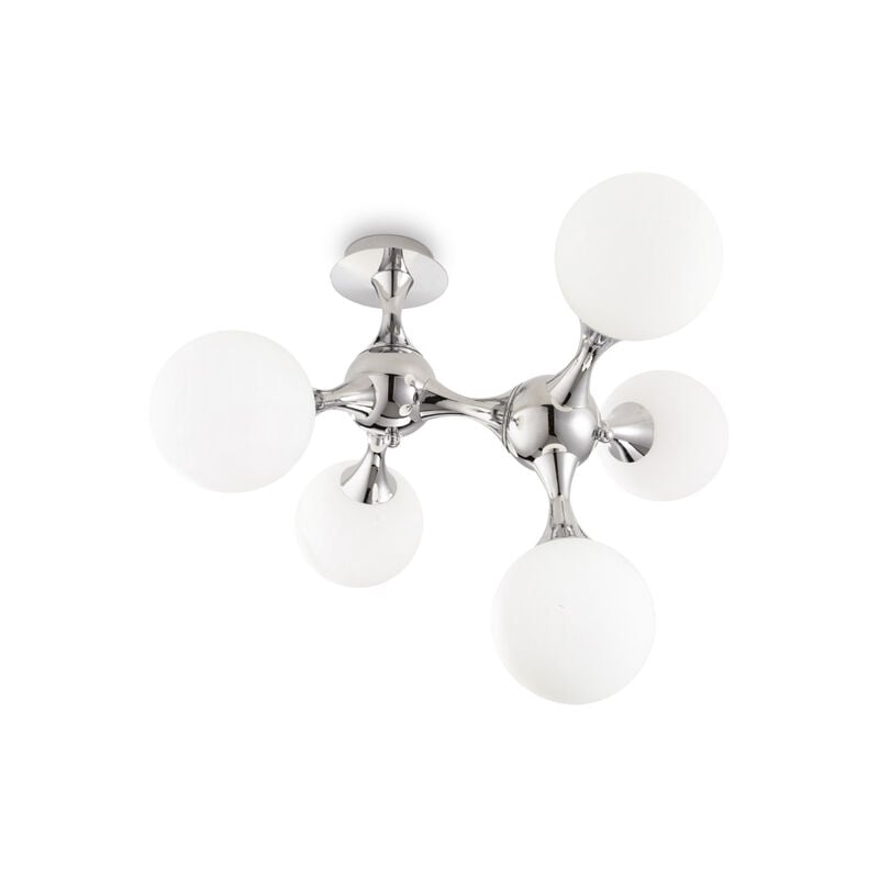 Collezione Nodi ELEMENTI RUOTABILI Plafoniera a 5 luci con montatura in metallo cromato. Elementi di giunzione ruotabili per una disposizione personalizzata.. Diffusori in vetro bianco soffiato e acidato.