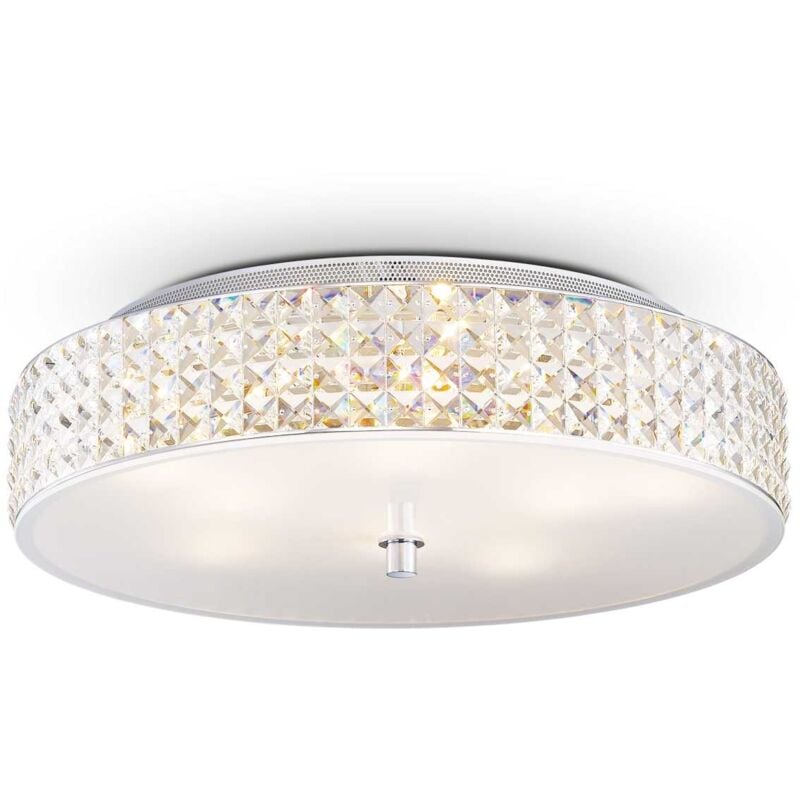 Montatura e dettagli in metallo cromato. Diffusore con elementi quadrati in cristallo molato sulla fascia laterale e vetro sabbiato sul fondo. Ø 500 x H 130 mm max 9 x 40W G9 IP:20