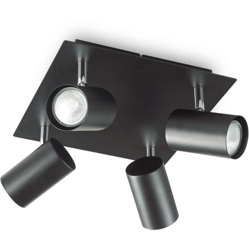 Base, montatura e diffusori in metallo rifinito con vernice opaca nera o bianca. Diffusori orientabili. L 30,5 x H 13 x P 30,5 cm max 4 x 50W GU10 IP20