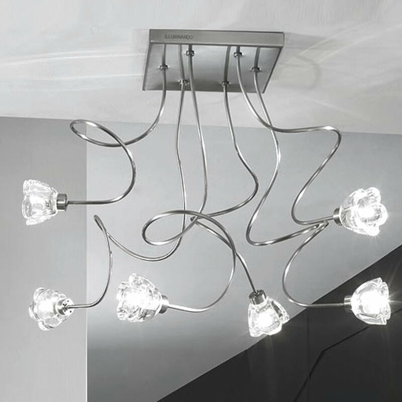 Plafoniera da soffitto moderna rifinita da vetri a fiore trasparenti per un effetto luminoso e leggero. Un modello dalla linea capricciosa e sinuosa che dona all'ambiente uno stravagante e giovanile movimento. Plafoniera Ginevra Clara 6 luci Illuminando Lampada da soffitto con bracci flessibili e attacco G9 LED La plafoniera ha una struttura in metallo cromato (a richiesta anche nikel satinato), completi di sei vetrini a forma di fiore in vetro pirex satinato e bordo trasparente. La lampada da soffitto è un modello moderno che si inserisce in modo armonioso in vari ambienti con un tocco di eleganza dovuto ai vetrini. I sei bracci sono orientabili per questo motivo è possibile illuminare come si preferisce l'ambiente. La plafoniera ha una tensione a 220/240V (quindi non necessita di driver) ed un indice di protezione IP20, quindi adatta ad ambienti asciutti come ad esempio corridoi, cucina, ingresso, camera. ecc... Il corpo illuminante è provvisto di sei portalampade con attacco G9 per