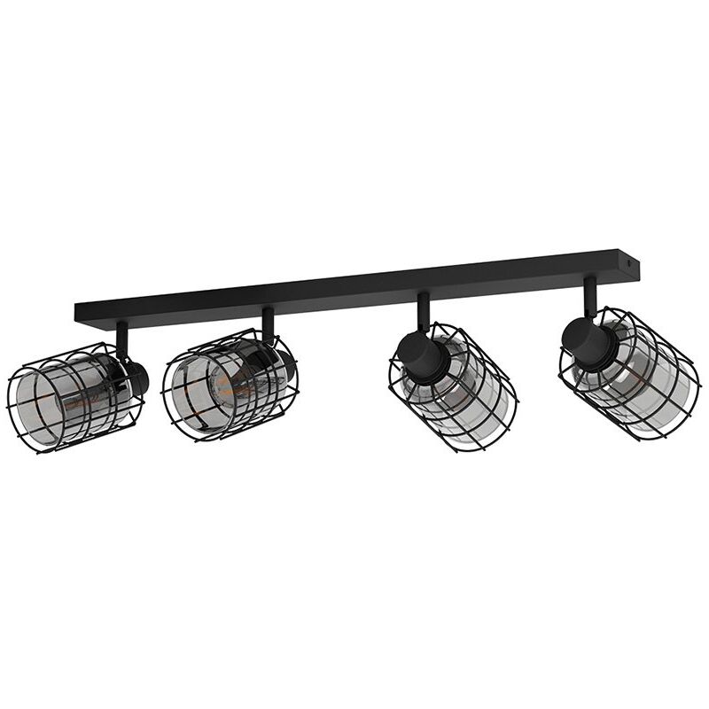 Collezione Consaca LA LUCE CHE GIOCA CON STILE La plafoniera CONSACA è composta da un corpo nero in metallo e da quattro faretti mobili.. Le teste sono composte rispettivamente da un telaio nero in reticolato con all'interno un cilindro in vetro fumé nero-trasparente che crea un intrigante gioco di luci e ombre quando la luce è accesa. Questo plafone si armonizza perfettamente con tendenze di arredamento moderno e, grazie alle teste regolabili, è possibile illuminare singoli punti in ogni ambiente, che sia nella cucina, nel soggiorno, nella camera da letto, nel corridoio o nella sala da pranzo. Le lampadine a filamento presenti nell'immagine non sono incluse nella consegna. Per la lampada è adatta qualsiasi lampadina con attacco E27.