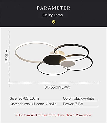 ★ Dimensioni plafoniera a LED: 80 * 65 * 10 cm (L * W * H), Potenza: 71 W, Materiale: ferro + alluminio + acrilico + gel di silice, colore: oro + bianco, bianco + nero, nero + oro (3 colori disponibile). Dimmer continuo (luce bianca fredda-luce naturale-luce bianca calda), con telecomando, è possibile regolare la luminosità e l'oscurità.
