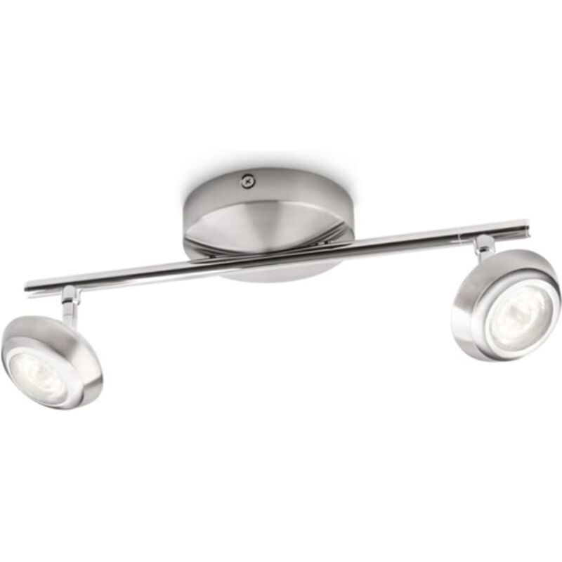 Barra spot a due luci Philips a teconologia LED in acciaio spazzolato con dettagli cromo. Ruota lo spot in qualsiasi direzione per indirizzare il suo fascio di luce bianca calda dove preferisci. Grazie alla sua avanzata tecnologia LED, ha una durata ultra prolungata e riparmia energia fino all'80% rispetto una fonte di illuminazone tradizionale. Ideale per creare una atmosfera accogliente in camera da letto e salotto.