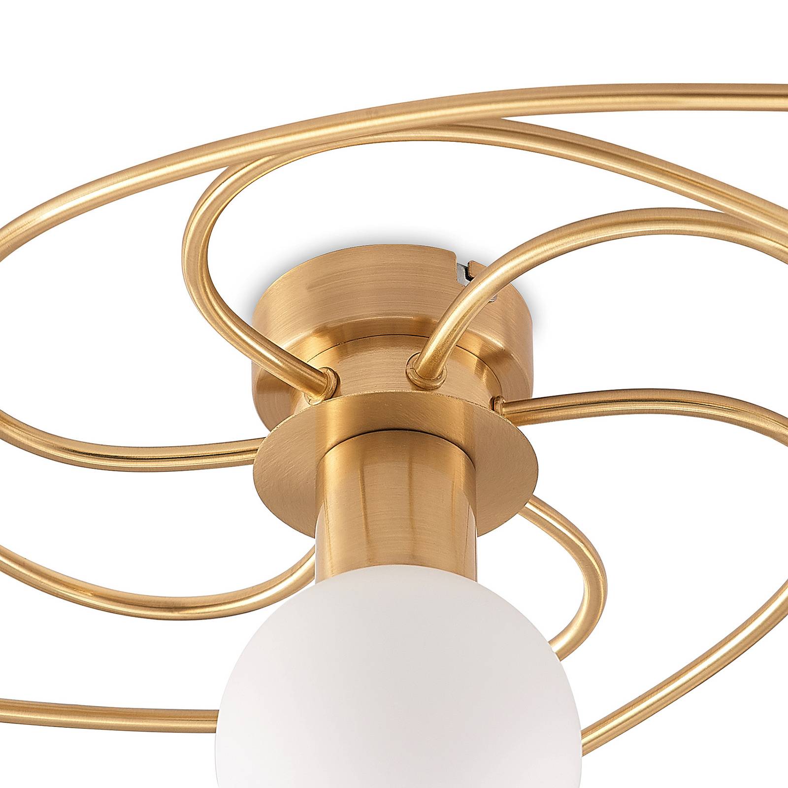 Plafoniera Ciala color ottone con forma a spirale di tendenza Ciala è una fonte di luce moderna che cattura immediatamente l'attenzione con la sua bella struttura curva in ferro color ottone. Allo stesso tempo, grazie al paralume bianco opalino, non si mette troppo in primo piano per non mettere in ombra i mobili. La plafoniera Ciala a 7 luci è in grado di illuminare bene anche gli ambienti più grandi e fa bella mostra di sé sul soffitto del soggiorno.