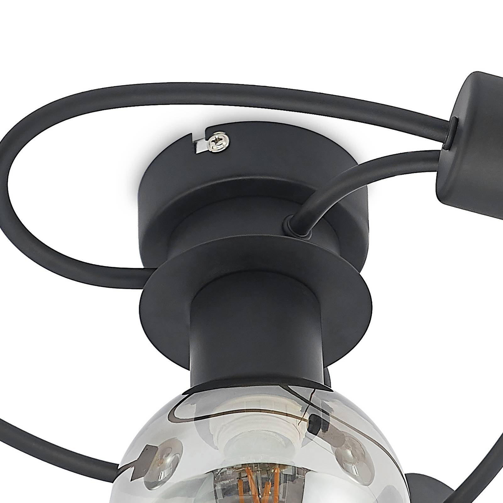 Plafoniera Ciala nera con paralume in vetro fumé La plafoniera Ciala si distingue per il chiaro linguaggio del design e la combinazione di colori scuri. Il fissaggio rotondo per soffitto e i bracci curvi della lampada sono in ferro e hanno una finitura nera. I quattro paralumi sono in vetro fumé e lasciano trasparire la luce con effetti meravigliosi. Questa lampada di tendenza è perfetta in un soggiorno o in una sala da pranzo e può essere abbinata molto bene agli stili moderni.