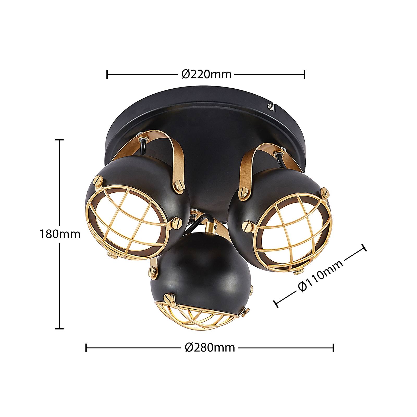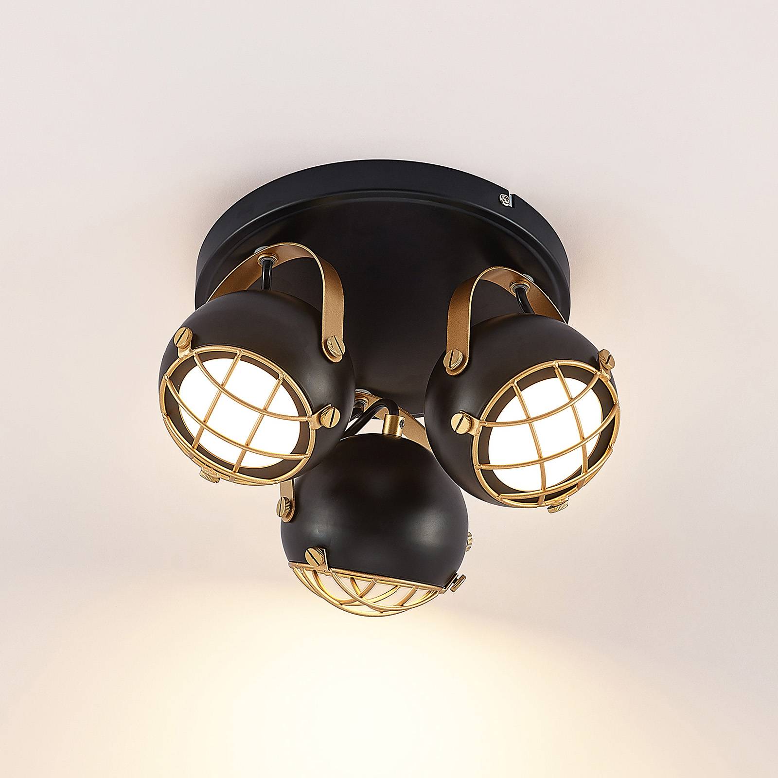 Plafoniera girevole Dawid a forma di rondello con accenti dorati La plafoniera Dawid è caratterizzata da una piastra rotonda a cui sono fissati tre paralumi. I paralumi possono essere ruotati e allineati individualmente grazie all'elemento girevole. La scelta dei colori è una caratteristica particolarmente interessante di questo apparecchio. La maggior parte della luce è di colore nero opaco. Questo rende l'apparecchio un elemento d'arredo moderno e adattabile. Tuttavia, in alcuni punti la lampada è rifinita con dettagli dorati. Ad esempio, il supporto e la griglia sono in oro. Questo conferisce alla lampada una certa vivacità e la rende un elemento di richiamo nel soggiorno.