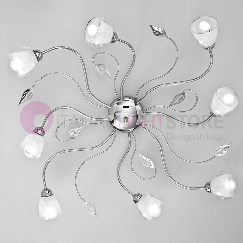 Lampada a soffitto a 8 luci, in metallo cromato, ideale per illuminare zone pranzo e camere da letto. Lampada a soffitto e a parete, plafoniera a 8 Luci con struttura in metallo cromato sagomato artigianalmente ;