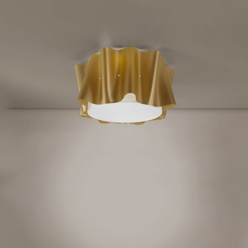 Collezione Folio DESIGN EFFETTO TESSUTO Lampada da soffitto moderna a 3 luci realizzata in polilux oro. Il materiale in cui è realizzata garantisce trasparenza e diffusione della luce, consentendo così di illuminare e arredare gli ambienti, scaldandoli e rendendoli accoglienti con particolare attenzione e cura ad ogni singolo dettaglio. Disponibile in diverse misure e finiture, la linea è composta anche da sospensioni, appliques, lampade da tavola e da terra. La lampada, disegnata dal design studio di MM Company, è formata da un'anima cilindrica in Polilux, alla quale è stata abbottonata una seconda superficie curva, che ricrea l'effetto morbido e leggero di un tessuto.
