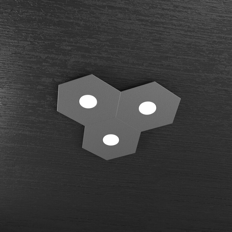 Collezione Hexagon IL FASCINO GEOMETRICO DELL'ILLUMINAZIONE LED Plafoniera 3 luci esagonale formata da lastre quadrate di metallo verniciato in finitura grigio antracite.. I componenti base sono due: uno con sorgente luminosa (1142/1L) e uno solo decorativo (1142/1D). Questi componenti possono essere assemblati fra loro per creare infinite forme e mix di colori. Per comodità vengono proposti alcuni kit precomposti con codice dedicato. La presente collezione in quanto componibile è indicata per risolvere problemi di decentramento tra punto luce e zona da illuminare. Un altro punto di forza del prodotto consiste nel non utilizzare dei led integrati ma una lampadina Gx53 che, una volta montata, arriva a filo della lastra metallica e può essere facilmente sostituita dall'esterno. Esempi di composizioni aggiuntive possibili: I componenti esagonali luminosi (1142/1L) possono essere assemblati fra loro illimitatamente. Le due regole da rispettare sono: 1. Tra due esagoni luminosi (1142/1L)