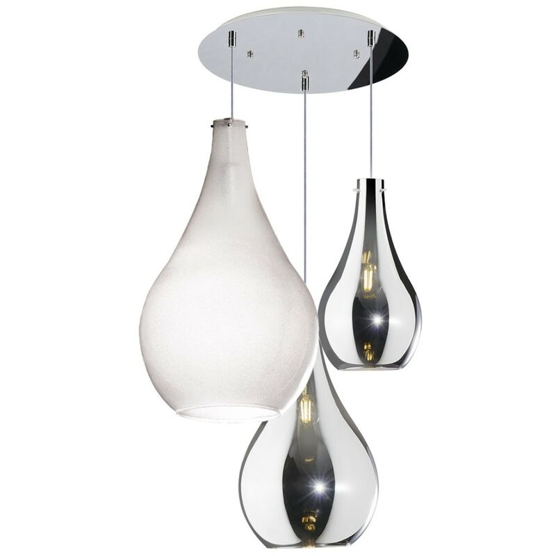 Plafoniera tre luci realizzata con originali gocce in vetro soffiato di dimensione e colori diversi che illuminano e al tempo stesso arredano la stanza. Una lampada da soffitto moderna e adatta per un arredamento contemporaneo, consigliata per il soggiorno, l'ingresso, il bagno, la camera matrimoniale o altra stanza dove la luce diventa l'unica protagonista di tutto l'ambiente. Plafoniera moderna Top Light DROP 1134 S3 TMIX Lampada soffitto, vetri a goccia bicolore, graniglia, attacco E14 LED Emissione di luce DIFFUSA soprattutto con il vetro graniglia che diffonderà luce in modo omogeneo e che grazie all'applicazione di granuli di vetro trasparente, una volta acceso, lo rendono brillante, invece il vetro colorato cromo avrà la funzione di creare una luce d'atmosfera e d'effetto. L'accoppiamento dei vetri graniglia con quelli colorati è stato creato per avere sia illuminazione diffusa e sia illuminazione d'effetto. Colore vetri: Un vetro bianco GRANIGLIA cm26)accoppiato a due vetri