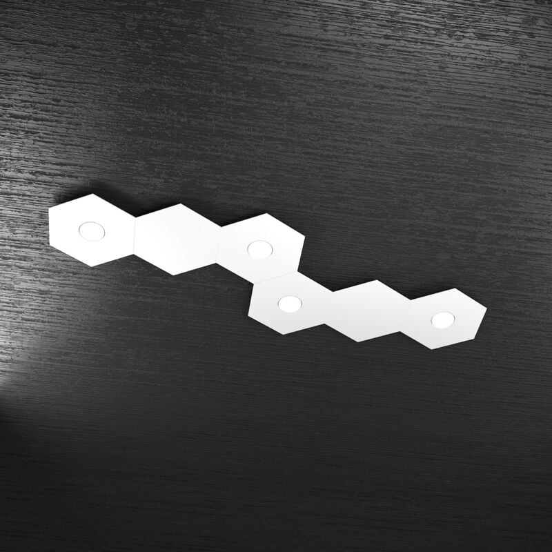 Collezione Hexagon IL FASCINO GEOMETRICO DELL'ILLUMINAZIONE LED Plafoniera esagonale formata da lastre quadrate di metallo verniciato in finitura bianca. Formata da 6 componenti, 4 con luce e 2 decorativi.. I componenti base sono due: uno con sorgente luminosa (1142/1L) e uno solo decorativo (1142/1D). Questi componenti possono essere assemblati fra loro per creare infinite forme e mix di colori. Per comodità vengono proposti alcuni kit precomposti con codice dedicato. La presente collezione in quanto componibile è indicata per risolvere problemi di decentramento tra punto luce e zona da illuminare. Un altro punto di forza del prodotto consiste nel non utilizzare dei led integrati ma una lampadina Gx53 che, una volta montata, arriva a filo della lastra metallica e può essere facilmente sostituita dall'esterno. Esempi di composizioni aggiuntive possibili: I componenti esagonali luminosi (1142/1L) possono essere assemblati fra loro illimitatamente. Le due regole da rispettare sono: 1.