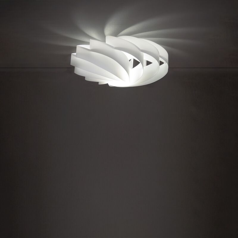 Collezione Flat DELICATA E DISTINTA Lampada da soffitto moderna a 1 luce realizzata in polilux bianco. Linea moderna e leggera, grazie al design minimal della spirale che con l' avvolgersi dei fogli in polilux crea infiniti giri intorno ad un punto, dona all'ambiente armonia ed eleganza. Ben si presta ad illuminare ed arredare il living abitativo o l' ambito commerciale dallo stile moderno e contemporaneo. Disponibile in diverse finiture e molteplici misure. Sorella della collezione Globe, la lampada Flat incarna un ideale matematico di bellezza. Un solido scomposto ma regolare, delicato e distinto.