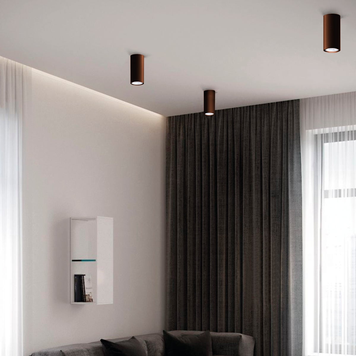 Plafoniera in metallo caratterizzata da un design moderno che diffonde gradevolmente la luce. Verniciata in colore corten. Particolarmente adatta ad ambientazioni in stile moderno. Disponibile nella versione con diametro di 6 centimetri ed altezza 10 centimetri (1xGU10).. Ideale come luce diffusa per una stanza di dimensione 10-15 mq. Consigliato per zona giorno e zona notte. Prodotto 100% Made in Italy. Disponibilità ricambi garantita per 7 anni. Riparabilità garantita al 100% in ottemperanza ai principi di economia circolare