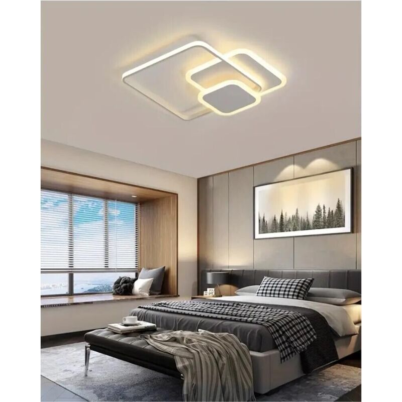 Plafoniera lampadario a led formato da 3 quadrati di diverse dimensioni sovraposti creando un tocco di elegante modernità. Specifiche: Potenza: 48 watt Flusso luminoso: 3840Lm CRI: RA>80 Angolo del fascio luminoso: 240 Gradi Kelvin: Luce naturale 4000k Alimentazione: AC 220V-240V/50 HZ-60HZ Struttura realizzata in metallo e pvc di colore bianco Dimensioni:520x500 mm Peso: 1.6kg Il contenuto della confezione: N 1 Plafoniera
