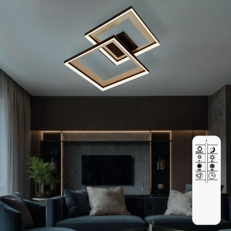 Descrizione Questa moderna plafoniera LED con due moduli LED (di cui uno girevole) attirerà l'attenzione nelle vostre stanze grazie al suo colore oro/marrone. Può essere utilizzata in vari modi, ad esempio come lampada da soggiorno o da camera da letto. La lampada può essere facilmente controllata dal divano utilizzando il telecomando incluso. Ad esempio, seleziona la temperatura del colore che preferisci e regola le condizioni di illuminazione individualmente in base alle tue esigenze (3000K-6500K). La temperatura del colore selezionata viene salvata automaticamente utilizzando la cosiddetta funzione di memoria. La lampada da soggiorno ha la classe di protezione IP20. La sorgente luminosa a LED è installata in modo permanente nella lampada. Lampada dettagli • Tipo di lampada: plafoniera • Materiale: plastica, metallo • Colore oro • Grado di protezione: IP20 • Classe di protezione: 2 • Circuito CCT: 3000 - 6500 Kelvin • Funzione timer • Funzione luce notturna • Dimmerabile (a