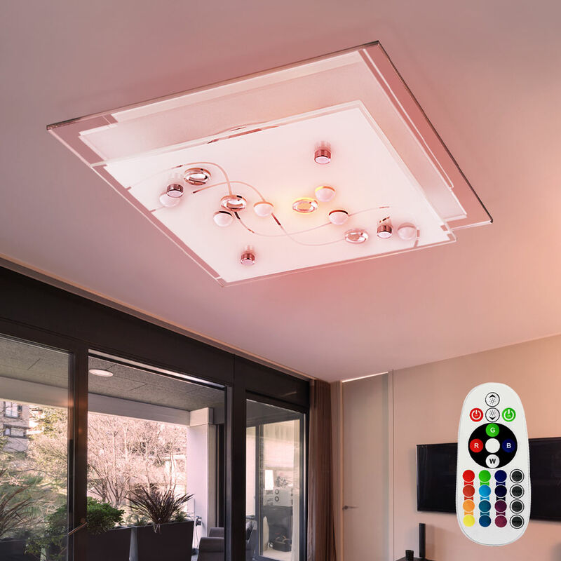 Descrizione Lampada da parete e soffitto moderna dal design quadrato. Questa lampada convince per la sua brillante luminosità e l'ottica imbattibile. Elementi in metallo e cromo di alta qualità in combinazione con vetro satinato e pietre decorative chiare testimoniano il gusto moderno e lo stile elegante. Questo apparecchio fa una bella figura in ogni stanza. Rispetto ai normali apparecchi di illuminazione, i faretti a LED consumano solo una minima quantità di elettricità e sono in consumo anche sotto luci a risparmio energetico. Questo protegge l'ambiente e il tuo portafoglio. Una lampada LED RGB di alta qualità a risparmio energetico con telecomando per luce bianca e controllo RGB è inclusa nella fornitura. Dettagli • Tipologia: Lampada da parete e soffitto • Materiale: metallo bianco, cromo • Vetro: Finitura satinata con righe, pietre decorative chiare • Dimensioni LxPxH in cm: 24x24x8,5 • presa: 1x E27 • sorgente luminosa inclusa: si • alimentazione sorgente luminosa: 1x 3,5 Watt