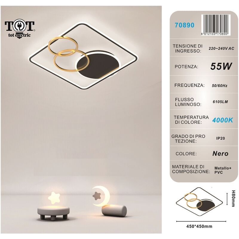 Plafoniera con illuminazione led dal design moderno e minimal. Struttura realizzato in alluminio di forma quadrata con all'interno 3 cerchi. Ideale per ambienti interni di casa, ristoranti, uffici, bar, locali commerciali, ecc. Installazione facile e veloce, poiché non necessita di montaggio. Caratteristiche tecniche Potenza 55W Flusso luminoso 6105lm Colore corpo Nero - Oro Voltaggio AC220-240V Frequenza 50/60Hz Dimmerabile No Uso Interno Luce disponibile 6500k bianca - 4000k naturale Materiale Alluminio + PVC Dimensioni Larghezza 450 mm Spessore 80 mm Tipologia: A Soffitto