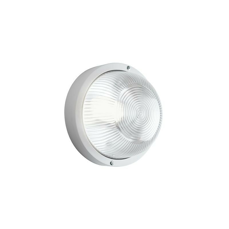 Plafoniera tonda con struttura in termoplastica. Diffusore in vetro stampato. Versione con gabbia e struttura in termoplastica. Altezza massima lampada: 107mm. Alimentazione 230 V. Classe di protezione: IP44 Potenza massima lampade: 40W