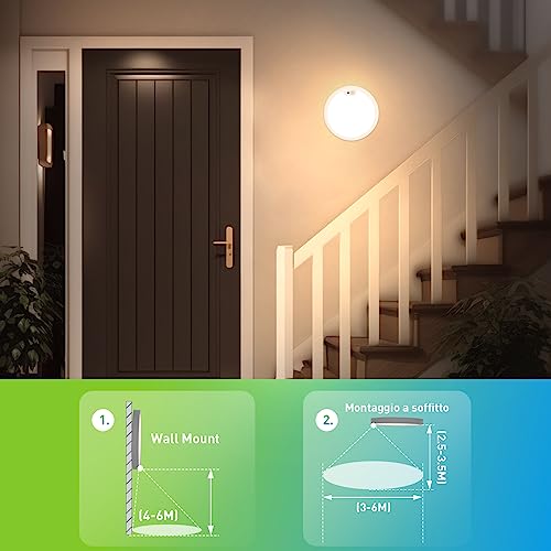 【Sensore di movimento e sensore crepuscolare】: La plafoniera LED dispone di funzioni di rilevamento del movimento umano e del crepuscolo, che possono rilevare intelligentemente il movimento entro un raggio di 3-5M e accendere automaticamente l'illuminazione quando la luce è insufficiente (