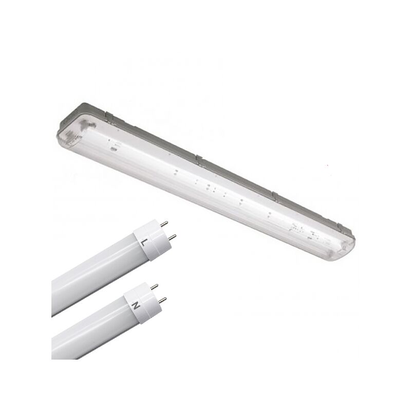 Plafoniera a tenuta stagna ip65 150cm 220v incluso di 2 tubi t8 50w P14-150-T8 La plafoniera stagna codice P14 con CONNESSIONE BILATERALE ospita 2 tubi LED con attacco T8 da 150cm (inclusi). Grazie al suo indice di protezione IP65 può essere installato anche in esterno, mantenendo protetti da umidità e intemperie i tubi led al suo interno. Il prodotto può essere installato a soffitto o parete grazie agli accessori di fissaggio inclusi. La plafoniera è inclusa i due TUBI LED T8 codice T8-50W-150 Caratteristiche tecniche: Marchio Potenza 2x 50W = 100W Tensione di funzionamento 220-240v AC 50-60 HZ (CONNESSIONE BILATERALE) Tecnologia LED Intensità luminosa 9850 lumens Resa rispetto un alogena 1000W Temperatura luce scegliere la tonalità di luce tra quelle disponibili Fascio di luce 120° Indice di protezione IP65 (adatta anche per esterno) Tipo di installazione da applique su parete/soffitto Materiali PVC e lega di alluminio Colore (finitura) Grigio Diffusore Policarbonato opaco Durata