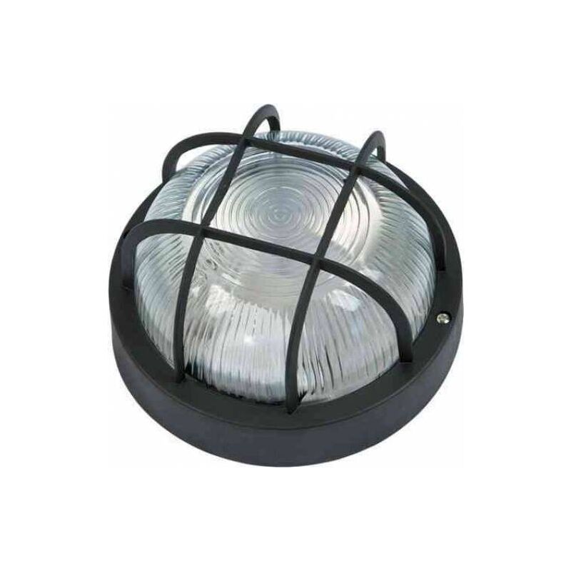 1,0 PZ Di PLAFONIERA TONDA GRIGLIA NERA in materiale termoplastico. A norme EN 60598-1 e EN 60598-2-1 con griglia di protezione Portalampada E27 per lampade ad incandescenza (max 60 W) o a basso consumo (max 11 W). Grado di protezione IP 44 Base
