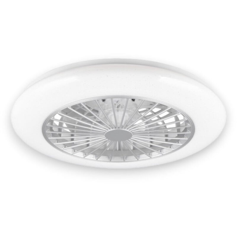 Plafoniera luce Led con ventilatore integrato, telecomando, dimmer integrato, luce notturna, 3 modalità di velocità per aria calda/fredda, colore della luce regolabile in 3 fasi effetto stelle o in modo continuo da 3000-6500K. Montaggio a soffitto. Struttura in plastica, potenza 30 Watt - 3500 lumen. Dimensioni Ø50xH16 cm.