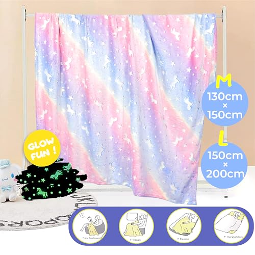 GLOW FUN Plaid Che si Illumina al Buio 130x150cm con Scatola Regalo Coperta Bambino Bambina Coperta Luminosa Coperta Unicorno Fluorescenti Plaid Morbina Regalo Coperta Glow in the Dark