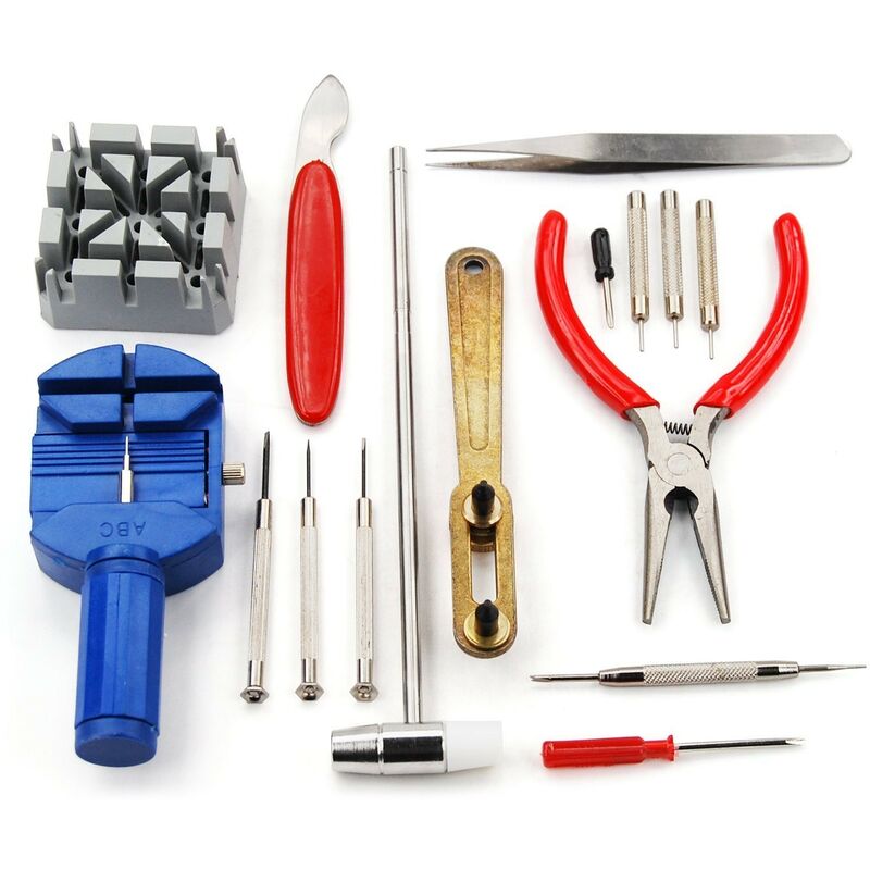 Set completo, indispensabile, pratico e professionale, per la riparazione degli orologi. Set completo, indispensabile, pratico e professionale, per la riparazione degli orologi. Kit riparazioni e manutenzione orologi da 16 pezzi che vi aiuteranno a montare, smontare, sostituire cinturini, riparare orologi e piccoli apparecchi elettronici. Questo prodotto viene fornito senza istruzioni, l'estetica ed il colore variano in base alla disponibilità di magazzino, comprende 3 cacciaviti metallici a lama piatta, 3 mini utensili metallici con punta conica piatta, 1 cacciavite metallico speciale a dobbia punta, 1 base, 2 minicacciaviti a stella con manico in plastica, 1 attrezzo apricasse a due pistoncini, 1 martelletto, 1 utensile a coltellino,1 utensile per sfilare i cilindri dalle maglie metalliche dei cinturini, 1 pinzetta, e 1 utensile a punta sottile acuminata.