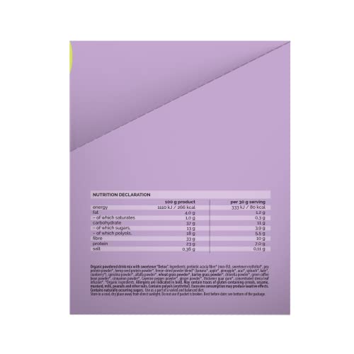 Una porzione (30 g) del frullato proteico organico (80 kcal) contiene: 7 g di proteine vegetali, 10 g di fibre e un mazzo di bontà verde: spinaci, cavolo riccio, spirulina, erba medica, clorella e germogli d'orzo. Per renderla una bomba energetica e salutare, abbiamo aggiunto ingredienti tonificanti naturali: zenzero, cannella, chicchi di caffè crudo e pepe di Caienna! Inizia bene la giornata con un sano frullato al mojito.