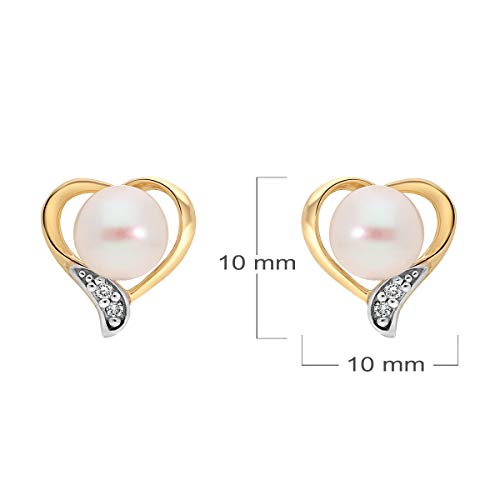 Planetys - Orecchini a forma di cuore in oro giallo 9 carati (375/1000), con perle coltivate e diamanti