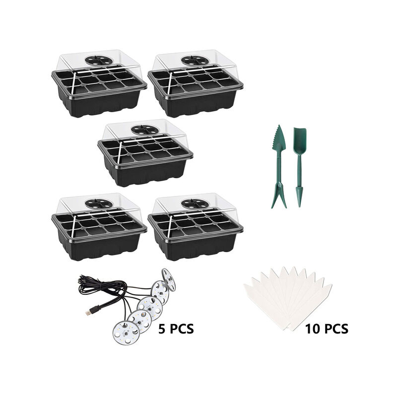 5 Pack Seed Starter Trays Kit, Seedling Trays Seed Starter Tray with Dome and Light Greenhouse Growing Trays Plant Germination Trays with Holes 60 Cell Per Tray New Design: With a plant growth light on the top lid, it can help your plants photosynthesize, resulting in rapid, natural growth and abundant harvests. Humidity Control: The lid of the seed tray has an adjustable air hole, you can adjust the humidity in the box, promote air circulation and help seed growth. And the bottom of each cell has drainage holes to prevent the root system from absorbing too much water, which can properly drain water and protect the roots from rot. Material: Seed Starter Trays are made of high-quality plastic, which is durable and reusable. And with a clear lid, it is perfect for watching the seed germinating and growing. Size: 7.28"L x 5.7"W x 4.3"H, each of the 12 cells has an ideal size of 1.5" x 1.5", perfect size for flowers, vegetables, fruits, and everything in between! 5 pcs Package includes: 5