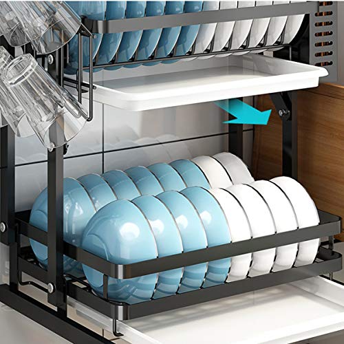 Plasaig Scolapiatti, Scolapiatti Pieghevole a 2 Livelli In Acciaio Inox e Scolapiatti Per Bancone Da Cucina, Grande Antiruggine Con Vassoio Estraibile Per Lavello, Porta Utensili, 52.5x38x12CM,Nero
