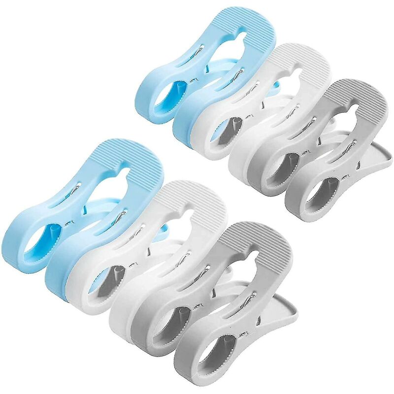 Design: i fermagli per asciugamani hanno un design a doppia porta, con dentellature antiscivolo sulle ganasce per migliorare l'attrito. Ci sono linee antiscivolo sul manico per una presa comoda. La robusta molla in metallo impedisce efficacemente che asciugamano e vestiti vengano spazzati via dal vento. Dimensioni: la lunghezza della molletta è di 12,5 cm, la larghezza è di 6,5 cm e la distanza tra le maniglie è di 7,7 cm. .Quantità - Il pacchetto include un totale di 6 clip antivento, due ciascuna in grigio, bianco e blu. Materiale - Le mollette sono realizzate in plastica pp. La superficie è liscia. Materiale addensato, antigoccia e resistente all'usura, durevole. Applicazione - Le clip antivento possono fissare saldamente vestiti, calze, asciugamani, copripiumini