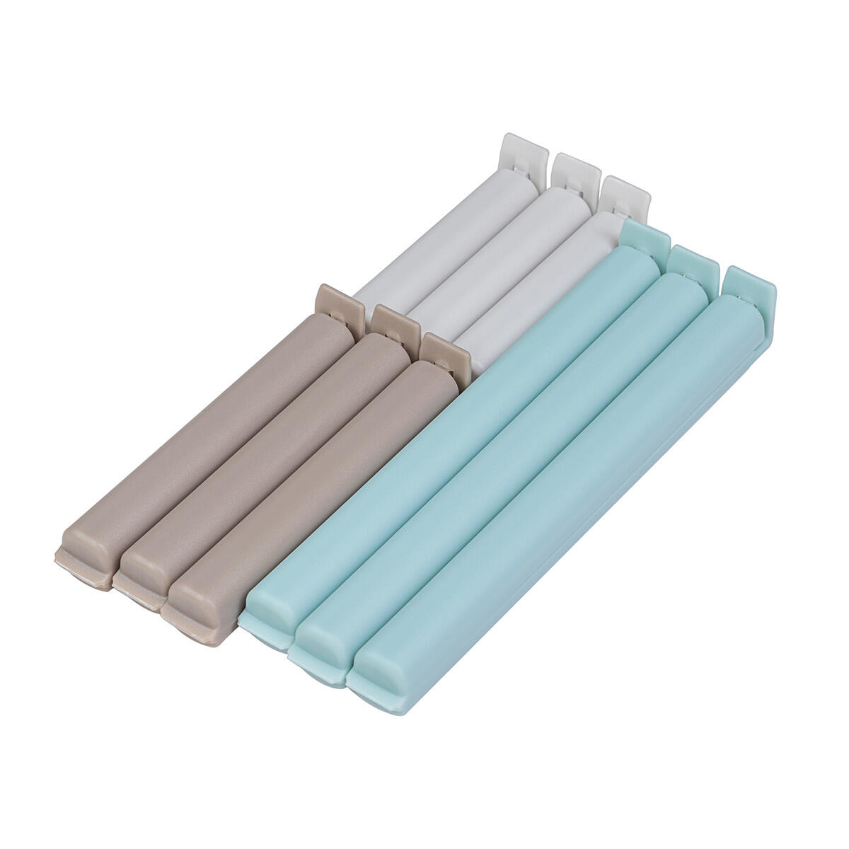 Set con 9 clips chiudi sacchetti in 3 misure differenti, di colore azzurro grigio e marrone chiaro.