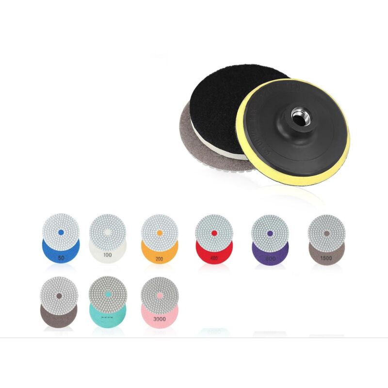 10pz platorello dischi 100mm lucidare levigare pavimenti piastrelle mattoni 533x platorello con strappo da 100 mm (4 pollici ) attacco m14 per flex levigatrici o trapani 9 dischi diametro 100 a strappo grana 30-50-100-200-400-800-1000-1500-3000 il kit comprende 10 pz in totale e' consigliabile utilizzare i dischi per lucidare a bagno di acqua in modo da avere un risultato migliore e lucente, quindi versando direttamente il liquido sulla superfice.