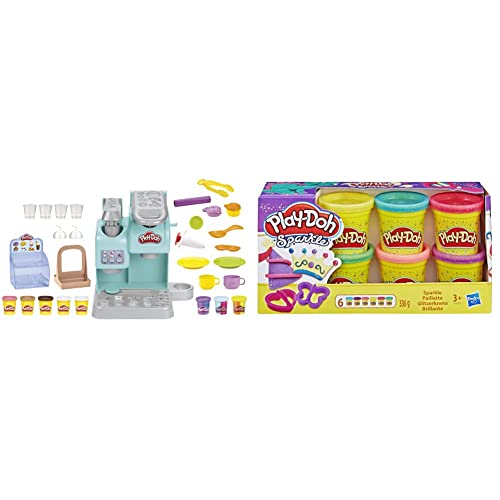Play-Doh, Kitchen Creations, La Caffetteria Super Colorata, playset con 20 Accessori e 8 vasetti di Pasta modellabile & Play-Doh - 6 Vasetti di pasta da modellare sparkle (con glitter)